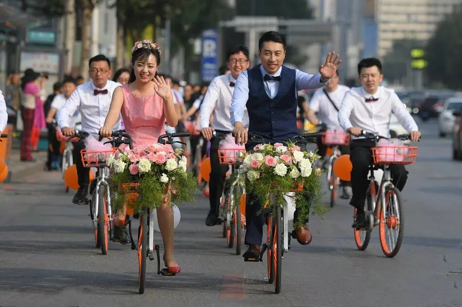 2017年9月9日,沈阳,一位新郎用共享单车编队迎娶新娘。