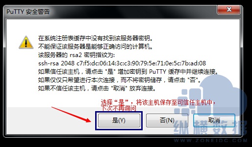 2、稍等片刻,会提示这个主机是第一次连接,向你询问是否信任(这是为了防止冒充等中间人欺骗手段的安全机制),直接点击“是”即可。