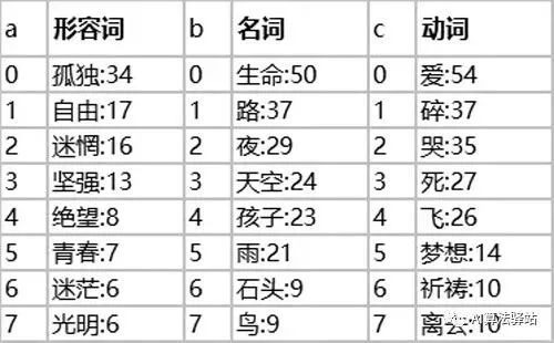 有一位网友统计了知名歌手在大陆发行的 9 张专辑中 117 首歌曲的歌词,同一词语在一首歌出现只算一次,形容词、名词和动词的前十名如下表所示(词语后面的数字是出现的次数):