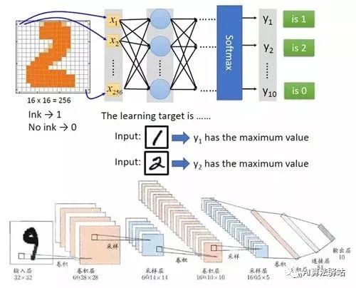 例如上面的例子,输入一个写着 2 的图片,输出的列表里面第二个数字最大,其实从机器来讲,它既不知道输入的这个图片写的是 2,也不知道输出的这一系列数字的意义,没关系,人知道意义就可以了。