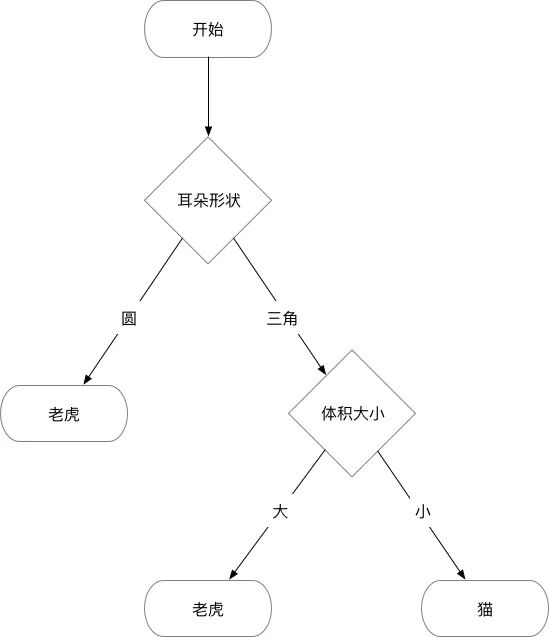 根据已有的数据集(经验),猫和老虎的决策树则是这样: