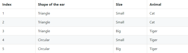 作为一个示例,这里假设将识别老虎分为 2 个特征,分别是耳朵的形状和体积大小,那么已知的数据可能是这样的: