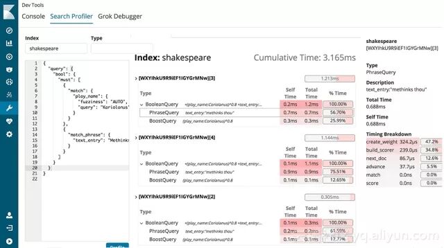 借助Kibana的开发工具,您可以跳过在终端键入的过程直接处理 Elasticsearch 数据。 与开源软件相比,Search Profiler 可让您轻松查看搜索请求期间花费的时间。并且在您的Logstash配置中创建复杂的 Grok 模式,使 Grok Debugger 变得轻而易举。下图为Search Profiler的功能展示: