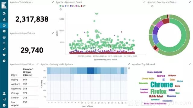 导读:阿里云Elastisearch集成了可视化工具Kibana,用户可以使用Kibana查询和分析存储在Elastisearch中的数据。Kibana 搭载了一些经典功能:柱状图、线状图、饼图、环形图,等等,充分利用了 Elasticsearch 的聚合功能。而且Dashboard功能能够将各种可视化组件集合成大屏。如下图所示,Kibana对网站应用的访客日志进行统计分析。