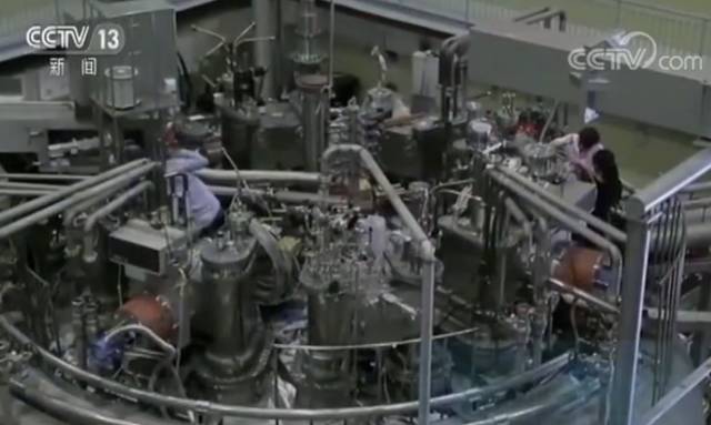 央视记者张春玲:“它的内部一个核心的部件就是像这样一个真空的环形舱。在这个真空环形舱里呢,有很多像这样温度在千万度,甚至上亿度的聚变燃料的原子核,而在这个真空舱的外部一则密布了横向和纵向的超导线圈。它仿佛就像是一个甜甜圈,悬浮在这个真空舱的内部。剧变燃料的原子核,在甜甜圈里面奔跑,碰撞,就会产生溢出巨大的能量。”